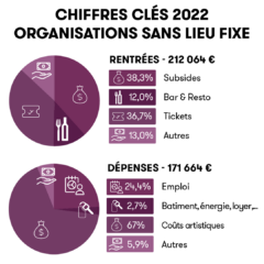 Les organisations sans lieu fixe quant à elles, ont une toute autre façon de fonctionner. Avec 1% d’employé·es permanent·es, 5% d’employé·es externes contre 93% de bénévoles et 1% d’autres travailleur·reuses non rémunéré·es, leurs réalités sont bien différentes. Évidemment, les dépenses dédiées à l’emploi sont diminuées ce qui laisse une part plus importante aux dépenses artistiques (toute proportion gardée). Les organisations sans lieu fixe perçoivent moins de subsides et assez peu de recettes bar (puisqu’elles sont souvent accueillies dans des lieux qui gardent la gestion du bar). Elles doivent donc compter principalement sur la vente de tickets.