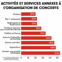 En comparaison avec 2022, l’activité en 2023 se recentre davantage sur l’organisation de concerts et d’événements accueillant du public. Nous remarquons que, avec la diminution du nombre de répondants parmi les petites organisations sans lieu fixe, les structures interrogées développent désormais toutes une ou plusieurs activités complémentaires à l’organisation de concerts. Parmi ces activités, celles liées aux outils et soutiens destinés aux artistes connaissent une croissance notable.
