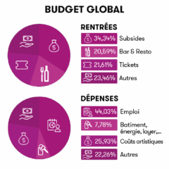 En 2023, le budget global montre une légère évolution par rapport à 2022, année encore marquée par les effets de la crise COVID. Du côté des recettes, la part des subventions diminue (passant de 43,4 % à 34,34 %), ce qui suggère une réduction des aides exceptionnelles post-pandémie. Les revenus liés aux tickets et au bar & restauration restent stables, tandis que la catégorie « autres » augmente (de 12,4 % à 23,46 %), ce qui pourrait indiquer une diversification des sources de financement pour compenser la baisse des subventions.
