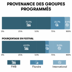 Concernant la provenance des artistes programmés, l’année 2023 reflète la réouverture des frontières et la reprise de la libre circulation des artistes internationaux, qui occupent désormais une part significative dans les programmations, particulièrement marquée dans les festivals. Bien qu’il ne soit pas possible de tirer des conclusions définitives à partir de deux échantillons distincts, une légère tendance semble émerger : une diminution de la visibilité des artistes flamands au sein des structures répondantes.