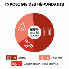 Le taux de réponse 2023 s’établit à 65 % (contre 71 % en 2022), avec 24 salles, 15 festivals et 7 organisations sans lieu fixe. La baisse s’explique notamment par les restructurations ou “temps morts” administratifs touchant certaines petites structures adhérentes post-COVID, tandis que la part des festivals répondants progresse avec la reprise de leurs activités.