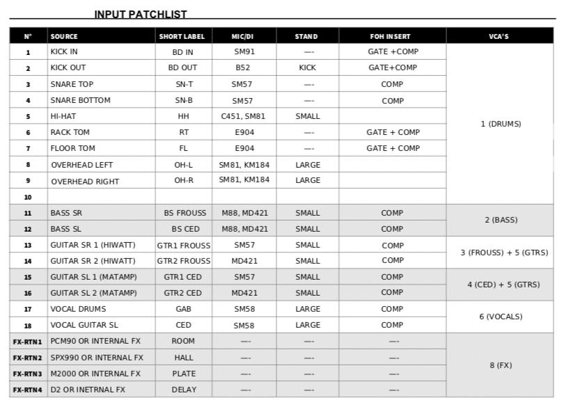 - le patch (numéroté, avec le nom de chaque source, le micro utilisé, si ce micro est fourni par vous même ou pas, éventuellement la taille du pied de micro ou s’il s’agit d’une pince, l’insert à brancher sur cette tranche s’il s’agit d’une console analogique, la liste des DCA s’il s’agit d’une console numérique, etc.)